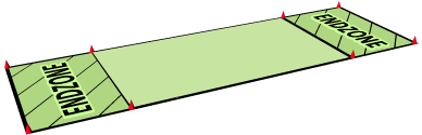 Dimensions and Field Type: As you’ll see in the videos, Ultimate is best played on a soft, flat grass field but can also be played on a hard surface like concrete or a gym floor. A regulation-size Ultimate field is 70×40 yards with two 25×40 yard endzones at each end of the length. However, for learning purposes a much smaller field is best. Your school’s facilities, such as a basketball court, is fine. A good dimension for starting out is 40×25 yards with 10×25 yard endzones. Always make sure to leave a buffer of 5-10 yards between the field and walls or fences.