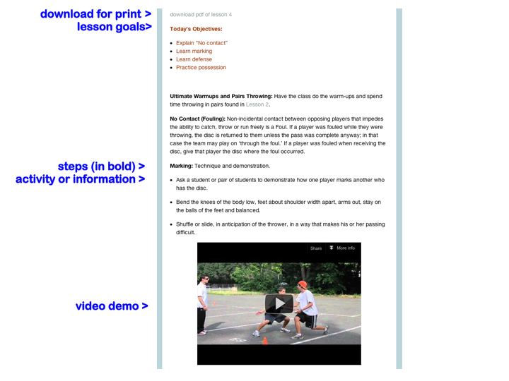Overview: To get the most from this site, please explore all 5 lessons before you begin using them in your gym classes. Read the descriptions, watch the video demonstrations, and if you need some more technical or troubleshooting advice, you can download the instructional pdfs on each lesson page. We suggest that the chronological sequence of lessons 1-5 is important to follow (when students first start out).