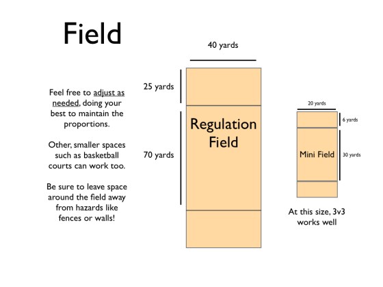 Field: Consider the field site you’ll be using for the rest of the lessons. Below are the full field dimensions, but often PE Teachers will have to make adjustments appropriate to their soccer field, football field, basketball courts, etc. Ultimate can be played on a variety of surfaces – soft grass is preferable – but gym floors, other flat surfaces and even parking lots may apply. Whatever surface you chose, know the risks and be aware of what is around you and your students.
